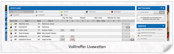 Beim Livecenter dürfte vor allem die Tatsache verwundern, dass dieses nur vollständig einzusehen ist, wenn Spieler sich vorab registrieren. Dies wird als etwas unangenehm empfunden, da die meisten Spieler sich erst bei einem Anbieter anmelden wollen, wenn sie wissen, was sie erwartet. An dieser Stelle lässt sich der Fairness halber aber direkt konstatieren, dass Volltreffer.com sich bei der Anzahl der Livewetten noch nicht mit Ruhm bekleckert.